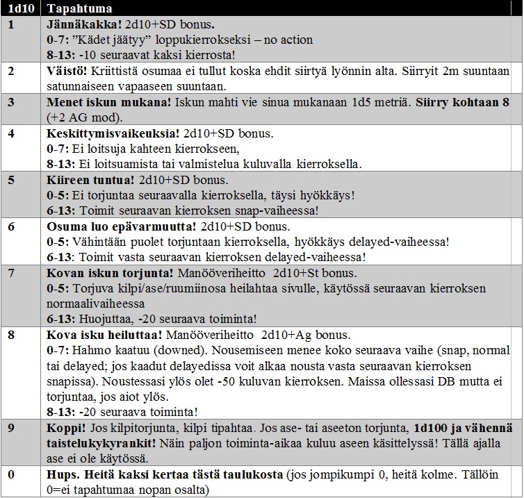 Lisäksi on mahdollista, että mikäli torjunta estää kriittisen, mutta ei osumaa (eli hyökkäys tekee kestopistevauriota), on mahdollista, että tapahtuu vielä jotain muutakin. Heitä tällöin 1d10 ja toimi taulukon mukaan.